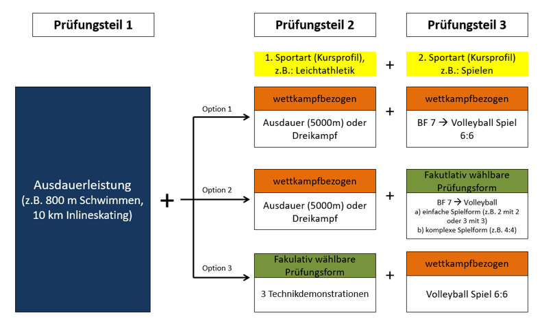 Die sportpraktische Prüfung im Fach Sport als Leistungskurs besteht verbindlich aus drei Teilen. Dabei haben alle Prüfungsteile gleiches Gewicht. Es können in der Praxisprüfung nur solche Inhalte und Gegenstände der Bewegungsfelder und Sportbereiche berücksichtigt werden, die auch vertieft im Unterricht des Kursprofils der Qualifikationsphase behandelt worden sind. Lediglich ergänzend oder zusätzlich behandelte Inhalte und Gegenstände können nicht Bestandteil der Praxisprüfung sein. Die sportpraktische Prüfung im Leistungskurs beginnt für den einzelnen Prüfling mit der Überprüfung der Ausdauerleistungsfähigkeit. Eine Nichtteilnahme an diesem Prüfungsteil führt zum Abbruch der sportpraktischen Prüfung. Der Prüfling muss dann eine Ersatzprüfung durchführen (siehe Verletzungsregelung in der jeweiligen Abiturverfügung der obersten Schulaufsicht). Im ersten Prüfungsteil müssen mindestens zwei Prüfungssportarten zur Wahl angeboten werden. Diese werden von der Fachkonferenz im Rahmen des Angebotes der Schule festgelegt. Eine Anbindung an die Profil bildenden Bewegungsfelder und Sportbereiche des jeweiligen Kursprofils ist nicht erforderlich. Voraussetzung ist, dass die Inhalte und Gegenstände zur Überprüfung der Ausdauer im Unterricht der Qualifikationsphase behandelt worden sind.