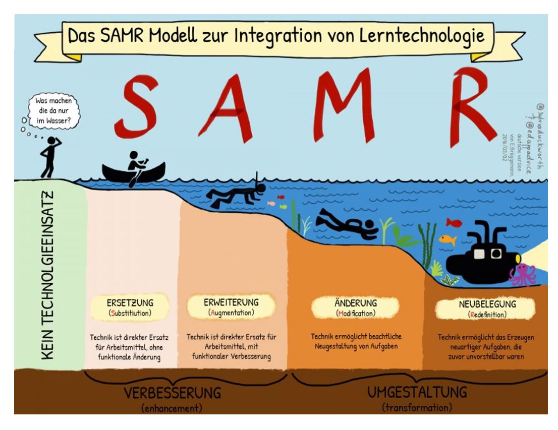 Eine fächerübergreifende Hilfe zur systematischen Einordnung des lernförderlichen Einsatzes digitaler Medien bietet das SAMR-Modell von Ruben R. Puentedura (2012)