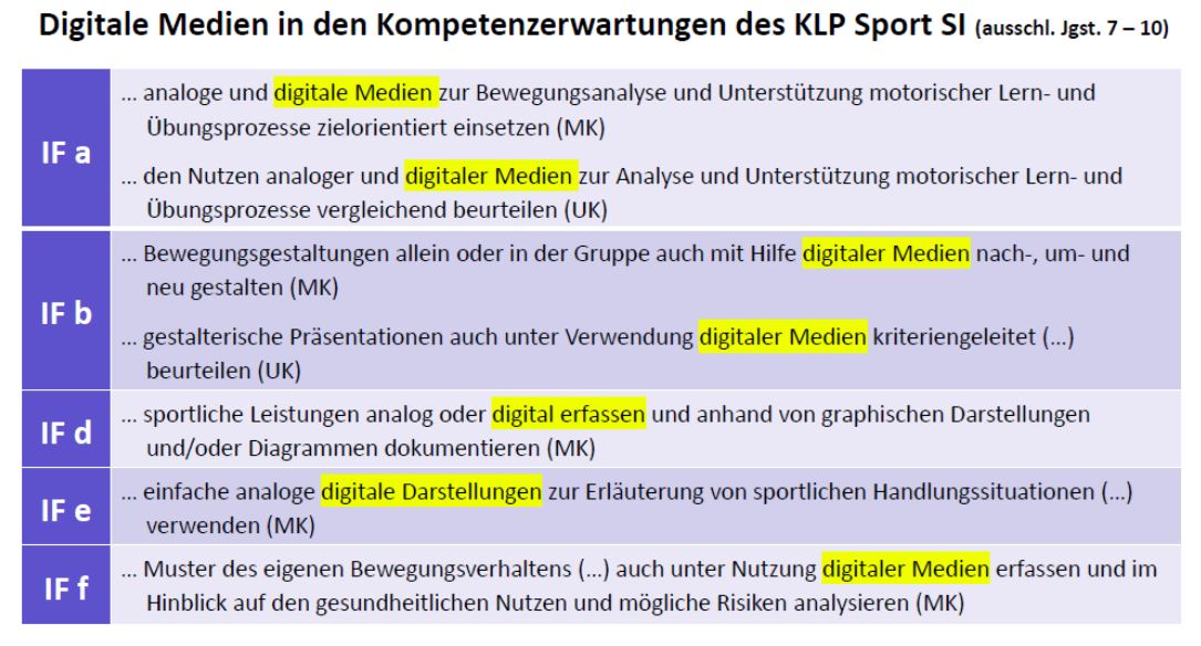 Die betreffenden Kompetenzerwartungen sind im KLP Sport auf alle sechs Inhaltsfelder verteilt, wobei erst in den Jahrgangsstufen 7 – 10 tatsächlich auch „digitale Medien" thematisiert werden.
