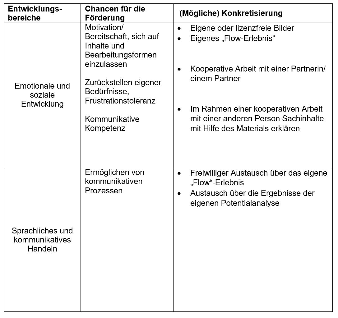 Im zieldifferenten Lernen kann sowohl ein Zugang über das fachliche Lernen als auch über die Entwicklungsbereiche gelegt werden. In diesem Unterrichtssetting können auf der Grundlage der individuellen Lern- und Entwicklungsplanung schwerpunktmäßig folgende Entwicklungschancen zum Tragen kommen