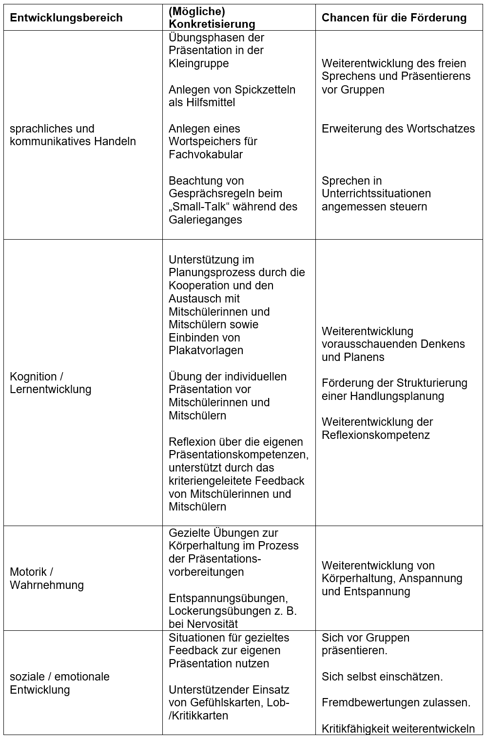 · Etablierung von Feedback im Planungsprozess durch Schülerinnen und Schüler und/oder Lehrkräfte · Ermöglichung von Übungssituationen (Gespräch während eines Galeriegangs) mit Feedback durch Schülerinnen und Schüler und/oder Lehrkräfte · die heterogene Gruppe bietet Sicherheit und geschützten Raum · Personale Unterstützung durch Peers systematisch ermöglichen · Gestaltung eines individuellen Spickzettels (z. B. Text zum Ablesen, Satzanfänge, Sätze, Wörter, Piktogramme, Skizzen …) zur Unterstützung für Gespräche während des Galeriegangs · Einsatz von Rückmeldekarten · Nutzung von Reflexionsbögen zur Selbst- und Fremdbeurteilung (M4.1/M4.2)