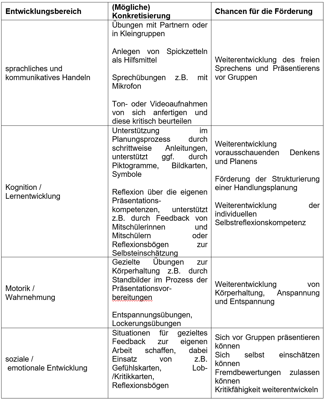 Insbesondere Schülerinnen und Schüler der zieldifferenten Bildungsgänge könnten sich hier besonders gefordert oder auch überfordert sehen. Eine enge individuelle personale Begleitung durch Lehrkräfte oder Schülerinnen und Schüler kann frühzeitig Frustrationen und Resignationen auffangen und eine erfolgreiche Präsentation für alle Schülerinnen und Schüler ermöglichen. Die in diesem Modul vorgesehenen Möglichkeiten des Ausprobierens der Präsentation oder Teilen dieser vor Partnern, kleineren Gruppen oder einer Kamera wirken in dem oben genannten Sinn zusätzlich unterstützend. In der Lerngruppe sollten unterschiedliche Präsentationstechniken bekannt und eingeübt sein.
