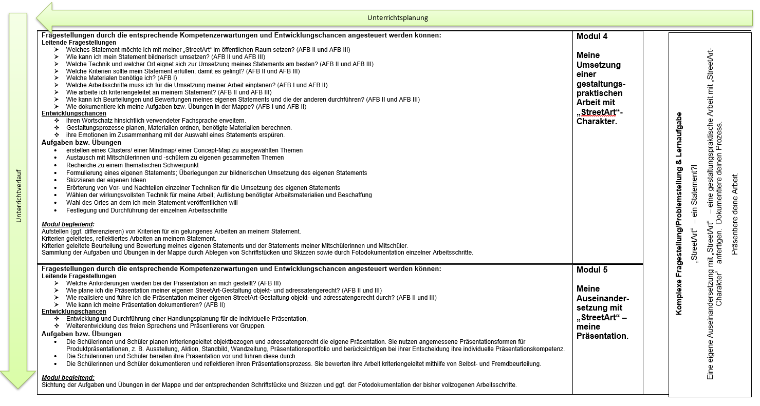 Die Lernaufgabe „Eine eigene Auseinandersetzung mit „StreetArt“ – eine gestaltungspraktische Arbeit mit „StreetArt-Charakter“ anfertigen“ – gliedert sich in die folgenden fünf Module: