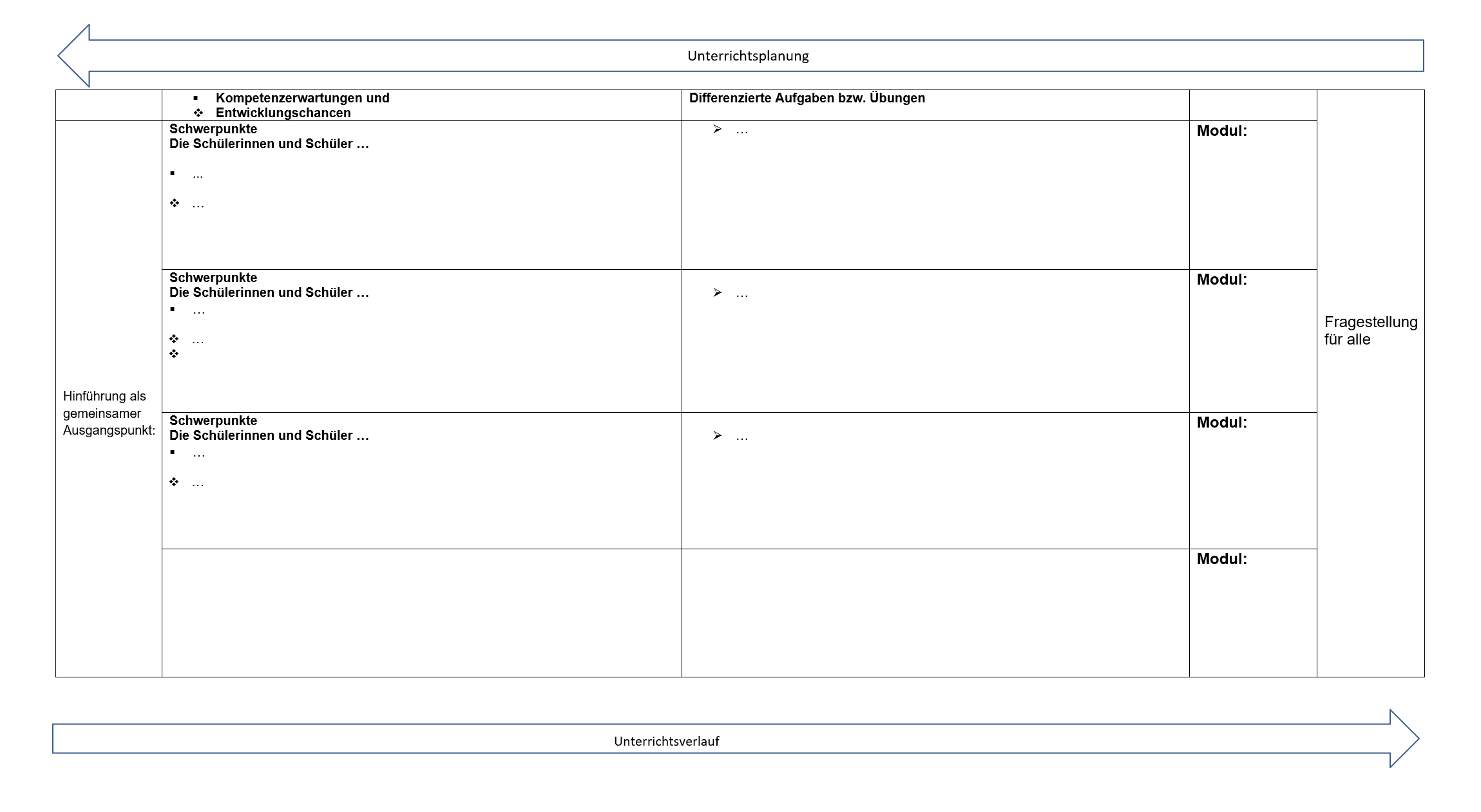 zugrunde liegt, ermöglicht ein Zusammenspiel verschiedener Planungselemente einen Fachunterricht, der im Rahmen des Gemeinsamen Lernens einer leistungsmäßig heterogenen Schülerinnen- und Schülergruppe eine Arbeit an einem gemeinsamen Lerngegenstand, der auf unterschiedlichen Erfahrens- und Erkenntniswegen erschlossen werden kann. Die Aufgaben sind curricular verankert und werden bestimmt durch die Kompetenzbereiche des Faches. Entsprechend der Lern- und Entwicklungsplanung werden fachliche Kompetenzerwartungen und Entwicklungschancen individuell gewichtet und durch vereinbarte Maßnahmen unterrichtlich eingebunden. Fachliche und sonderpädagogische Beiträge zur Unterrichtsplanung können in der Planung einer solchen Lernaufgabe von unterschiedlichen Professionen zusammengeführt werden. Die Nutzung des Modells oder Teilbereiche des Modells können als Schablone, über die ein gemeinsamer Austausch stattfindet, für eine Unterstützung einer gemeinsamen Unterrichtsplanung dienen (Roters/Gerlach/Eßer, 2018, 20)