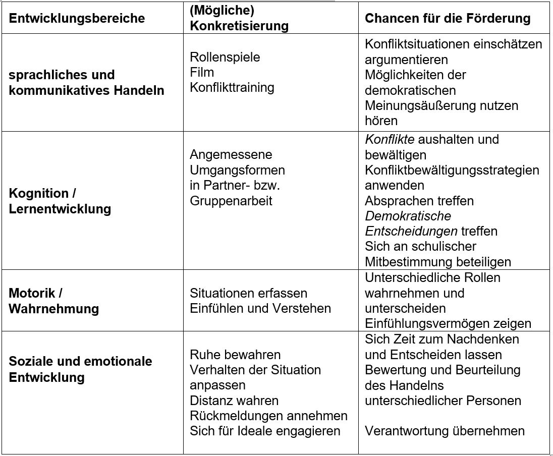 Im zieldifferenten Lernen kann sowohl ein Zugang über das fachliche Lernen als auch über die Entwicklungsbereiche gelegt werden. In diesem Unterrichtssetting können auf der Grundlage der individuellen Lern- und Entwicklungsplanung schwerpunktmäßig folgende Entwicklungschancen zum Tragen kommen: