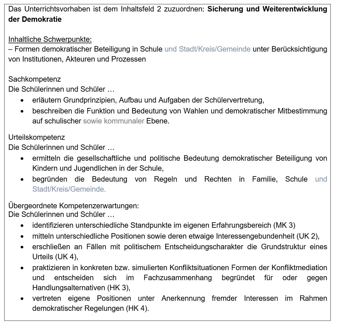 • beteiligen sich an demokratischen Entscheidungsprozessen in der Klassen- und Schulgemeinschaft (u. a. Abstimmungen, Beratungen) und setzen Mehrheitsentscheidungen um.
