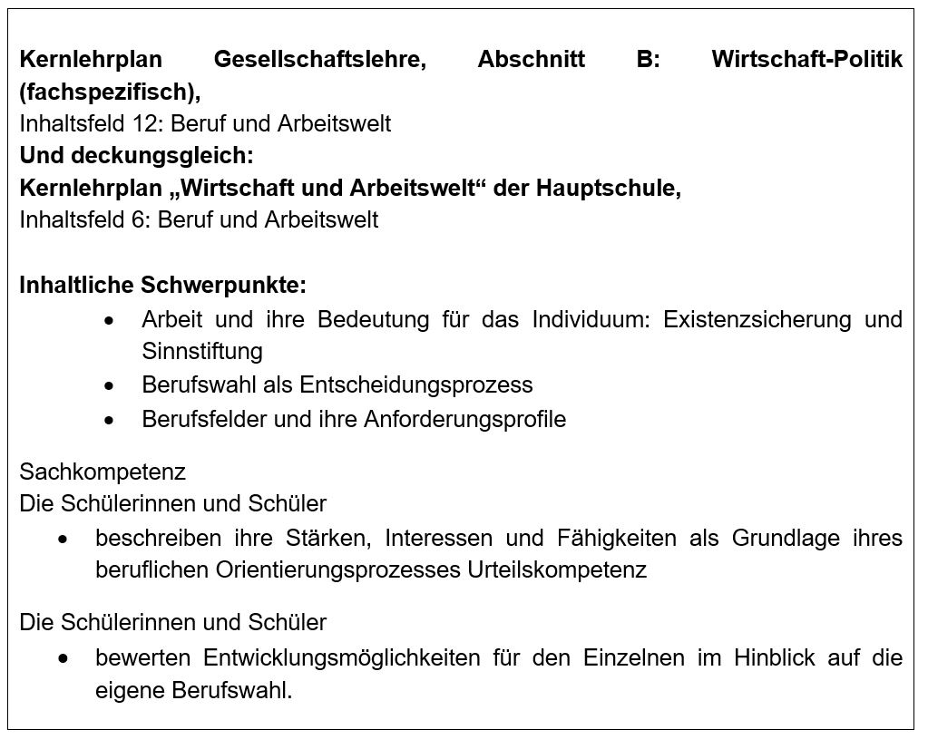Im Fokus dieser Lernaufgabe stehen Kompetenzerwartungen aus dem Inhaltsfeld 12: Beruf und Arbeitswelt im Kernlehrplan Wirtschaft-Politik, eingebettet in den Kernlehrplan Gesellschaftslehre für die Sekundarstufe I Gesamtschule/Sekundarschule, Abschnitt B: Wirtschaft-Politik (fachspezifisch) Jahrgangsstufen 7-10. Im Hinblick auf die Ermöglichung zieldifferenten Lernens werden Kompetenzerwartungen des Kernlehrplans „Wirtschaft und Arbeitswelt“ für die Hauptschule (bitte ein i einfügen: Der Entwurf des Lehrplans für die Primarstufe wird hier als Referenzdokument eingefügt, da gemäß der Ausbildungsordnung Sonderpädagogische Förderung (AO-SF) der § 32.2 zur Leistungsbewertung im zieldifferenten Bildungsgang Lernen zu beachten ist: (2) Die Schulkonferenz kann beschließen, dass ab Klasse 4 oder ab einer höheren Klasse die Bewertung einzelner Leistungen von Schülerinnen und Schülern zusätzlich mit Noten möglich ist. Dies setzt voraus, dass die Leistung den Anforderungen der jeweils vorhergehenden Jahrgangsstufe der Grundschule oder der Hauptschule entspricht. Dieser Maßstab ist kenntlich zu machen.) angesteuert und Kompetenzen aufgegriffen, die dem Inhaltsfeld 6: Beruf und Arbeitswelt zuzuordnen sind. Wobei die Kompetenzerwartungen beider Inhaltsfelder deckungsgleich sind..