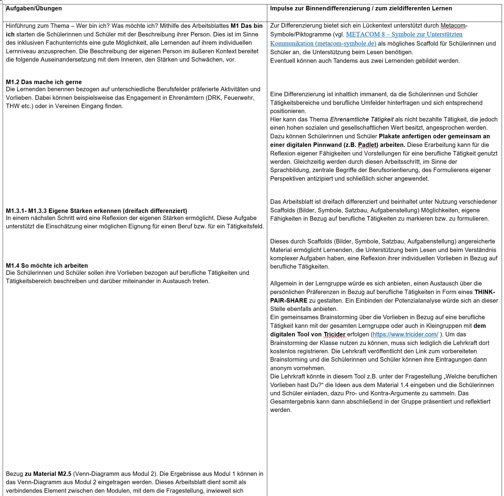 Im Modul 1 beschreiben die Schülerinnen und Schüler ihre Stärken, Interessen und Fähigkeiten als Grundlage ihres beruflichen Orientierungsprozesses. Ziel dieses Moduls ist es, die persönlichen Entwicklungsmöglichkeiten mit Blick auf die eigene Berufswahl zu erkennen und zu bewerten. Arbeit ist aktiv-gestaltende und planvolle Auseinandersetzung mit der Umwelt. Sie vermittelt gesellschaftliche Anerkennung, steigert das Selbstwertgefühl und wird als wichtiger Bestandteil eines sinnerfüllten Daseins erlebt. Arbeit strukturiert den Arbeitsablauf und gliedert das Leben in Arbeitszeit und Freizeit. Sie sichert die Existenz und trägt zur Unabhängigkeit bei. Arbeit gliedert das Leben in biografische Abschnitte. Hierbei spielt die Auseinandersetzung mit den eigenen Stärken und Schwächen eine große Rolle. Dieses Modul soll den Schülerinnen und Schülern eine Orientierung im Rahmen ihrer Identitätsentwicklung ermöglichen, indem sie die eigene Persönlichkeit in Abgrenzung zu anderen erfahren. Auf dieser Grundlage erarbeiten die Schülerinnen und Schüler in einem individuellen Zugriff persönliche Wünsche und Ideen von einer zukünftigen beruflichen Tätigkeit. Die hier exemplarisch aufgeführten Materialien sind in der Komplexität der Darstellung reduziert, verwenden Gestaltungsprinzipien der Leichten Sprache (kurze einfache Sätze, Verwendung einer serifenarmen Schrift, Visualisierungen durch Symbole bzw. Icons aus der Unterstützten Kommunikation) und zeigen damit Möglichkeiten, einen Austauschprozess über Zukunftsvorstellungen im Rahmen des Gemeinsamen Lernens gestalten zu können. Für die Schülerinnen und Schüler in den normierten Bildungsgängen können entsprechende Materialien aus der Berufsvorbereitung bzw. den eingeführten Lehrwerken hinzugezogen werden. Diese wiederum können durch Differenzierung (Reduzierung der Komplexität, Gestaltungsprinzipien der Leichten Sprache…) geöffnet werden. Weitere Möglichkeiten werden im Abschnitt „Konkretisierte Planungshinweise mit Impulsen zur Binnendifferenzierung / zum zieldifferenten Lernen“ aufgezeigt. Zunächst setzen sie sich mit ihrer eigenen Person auseinander (Arbeitsblatt M1.1 Das bin ich). Der Einstieg bietet sich an, um ausgehend von der eigenen Lebenssituation eine Auseinandersetzung mit selbstbestimmten und eigenverantwortlichen Entscheidungen im Hinblick auf den Übergang in die Berufs- und Arbeitswelt anzuregen. Um die Reflexivität weiterzuführen, werden auf Arbeitsblatt M1.2 Das mache ich gerne eigene Präferenzen und Wünsche mit Blick auf die berufliche Ausbildung thematisiert und individuell formuliert. An dieser Stelle geht es darum, den Schülerinnen und Schülern Impulse anzubieten, die es ermöglichen, ein breites Spektrum von Aktivitäten und Handlungsfeldern zu öffnen. Nachdem die Lernenden sich mit der eigenen Person und den Vorlieben und Wünschen beschäftigt haben, greifen die Arbeitsblätter M1.3.1 - M1.3.3 Eigene Stärken erkennen nun die individuellen Fähigkeiten auf. Hier werden Begriffe und Formulierungen verwendet, die auch in einer Potenzialanalyse relevant sind. Es geht also nicht allein darum, die Stärken der Schülerinnen und Schüler zu fokussieren, sondern auch darum, diese treffend benennen zu können. Dieser Schritt dient zur Vorbereitung der konkreten Auseinandersetzung mit beruflichen Vorstellungen und Tätigkeitsfeldern, die durch Arbeitsblatt M1.4 So möchte ich arbeiten angeregt wird. Auch an dieser Stelle wird der Individualität der Schülerinnen und Schüler Rechnung getragen. So kann das in Modul 2 vorgesehene Venn-Diagramm (M2.5) bearbeitet werden. Die Arbeitsblätter können einzeln bearbeitet oder auch in dem Portfolio zusammengeführt werden. Die Arbeit an dem Modul kann mit einer Reflexion des Moduls und einer Überleitung auf das zweite Modul anhand des Advance Organizer abgeschlossen werden