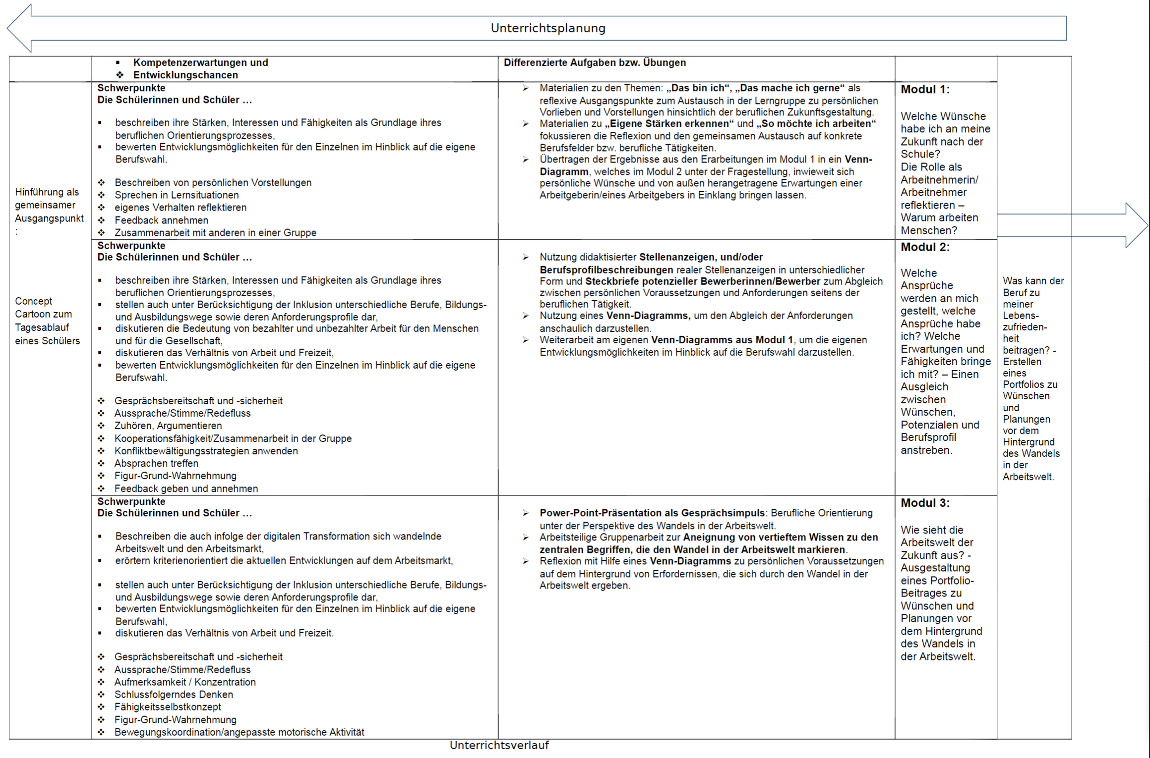 Im Modul 1 wird dieser Bereich angesteuert. Zugleich trägt dieses Modul der in Nordrhein-Westfalen an den Schulen etablierten Maßnahmen der beruflichen Orientierung dahingehend Rechnung, dass die angestrebten Arbeitsergebnisse der Schülerinnen und Schüler unmittelbar für eine Potenzialanalyse oder individuelle Beratungssettings genutzt werden können.